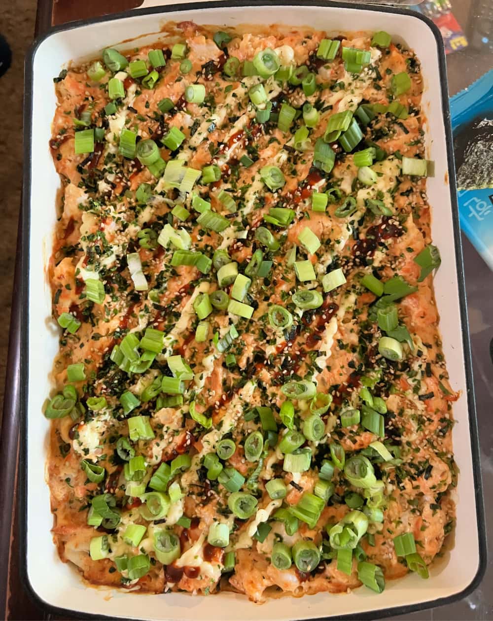 - Take sushi bake out of the oven. Top with drizzles of Kewpie mayo, Sriracha, furikake, toasted sesame seeds, and chopped green onions.